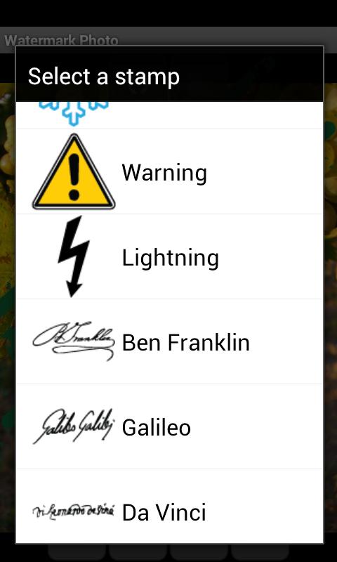 Watermark your pictures with text, timestamps, images, QR codes, and signatures. Watermark ships with different stamps including signatures of Einstein, Da Vinci, Copyright, Top Secret, and other fun stamps. Fonts, color, and opacity can be modified. Scale, rotate, and move watermarks easily with touch gestures.